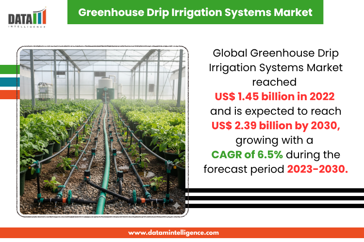 AUSTIN, TX, UNITED STATES, September 30, 2025 /EINPresswire.com/ -- The global greenhouse drip irrigation systems market is experiencing robust growth driven by increasing demand for water-efficient agricultural solutions, government subsidies, innovation from key manufacturers, and technological improvements tailored for productivity and sustainability. According to market intelligence from DataM Intelligence, the global greenhouse drip irrigation systems market reached US$1.45 billion in 2022 and is forecasted to climb to US$2.39 billion by 2030, showcasing a compound annual growth rate (CAGR) of 6.5% during 2023โ2030. These systems, which are revolutionizing greenhouse and controlled-environment agriculture (CEA), directly deliver water and nutrients to crop root zones, thereby maximizing efficiency, reducing waste, mitigating drought impact, and boosting crop yields.— DataM Intelligence