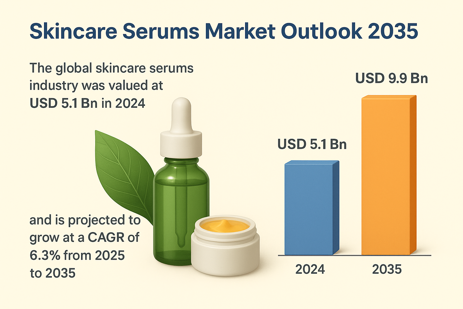 WILMINGTON, DE, UNITED STATES, September 30, 2025 /EINPresswire.com/ -- The global skincare serums market, valued at USD 5.1 billion in 2024, is expected to witness steady growth and reach USD 9.9 billion by 2035. Driven by rising consumer demand for advanced skincare solutions, the market is projected to expand at a CAGR of 6.3% from 2025 to 2035.