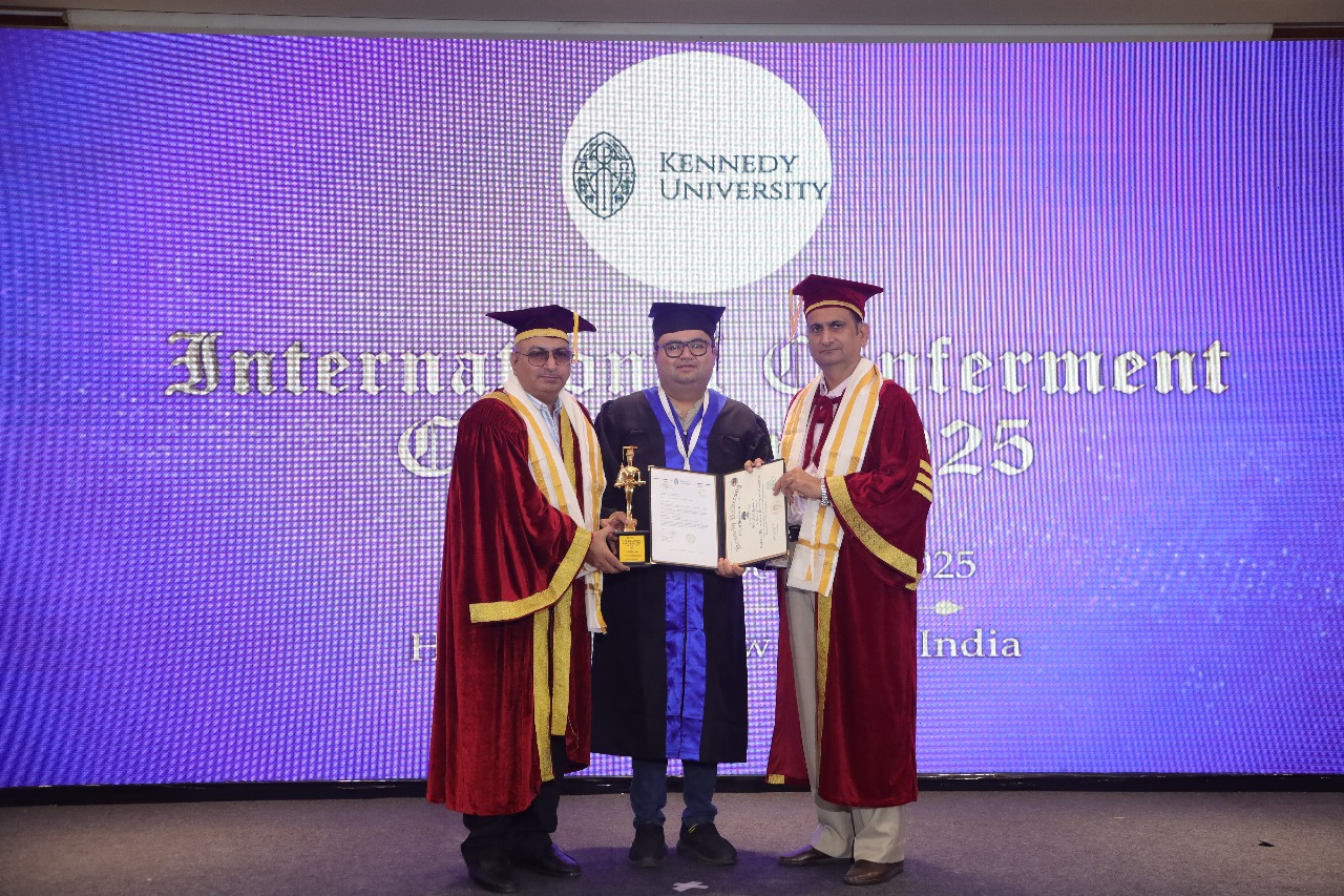 Dr. Kaushal Kakkad receiving honorary PhD in Marketing and Innovation from Kennedy University officials during the International Conferment Ceremony 2025