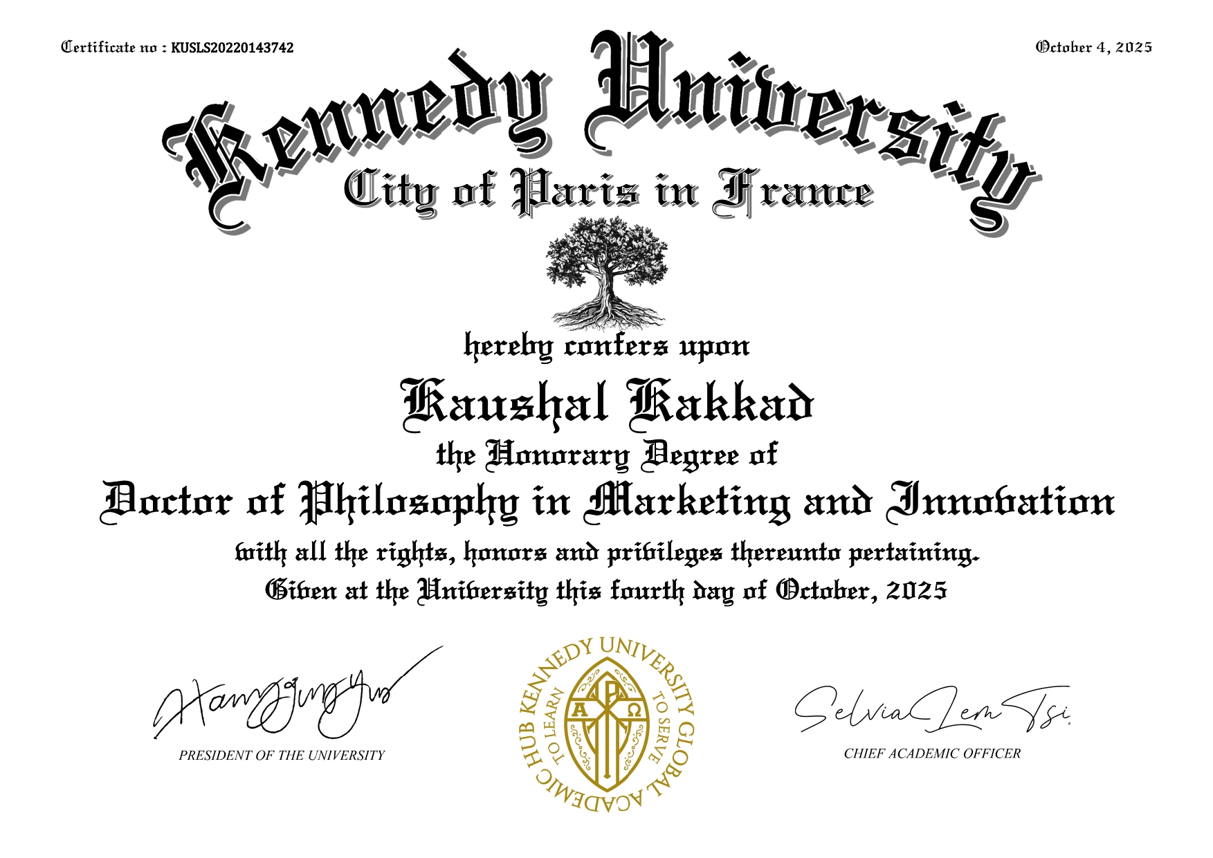 Honorary Doctor of Philosophy in Marketing and Innovation certificate awarded to Dr. Kaushal Kakkad by Kennedy University on October 4, 2025