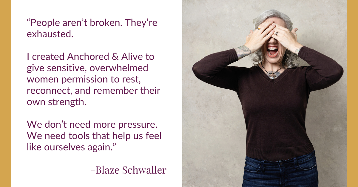 A signature message from Blaze Schwaller, host of Anchored & Alive, emphasizing emotional rest, self-trust, and resilience for sensitive women