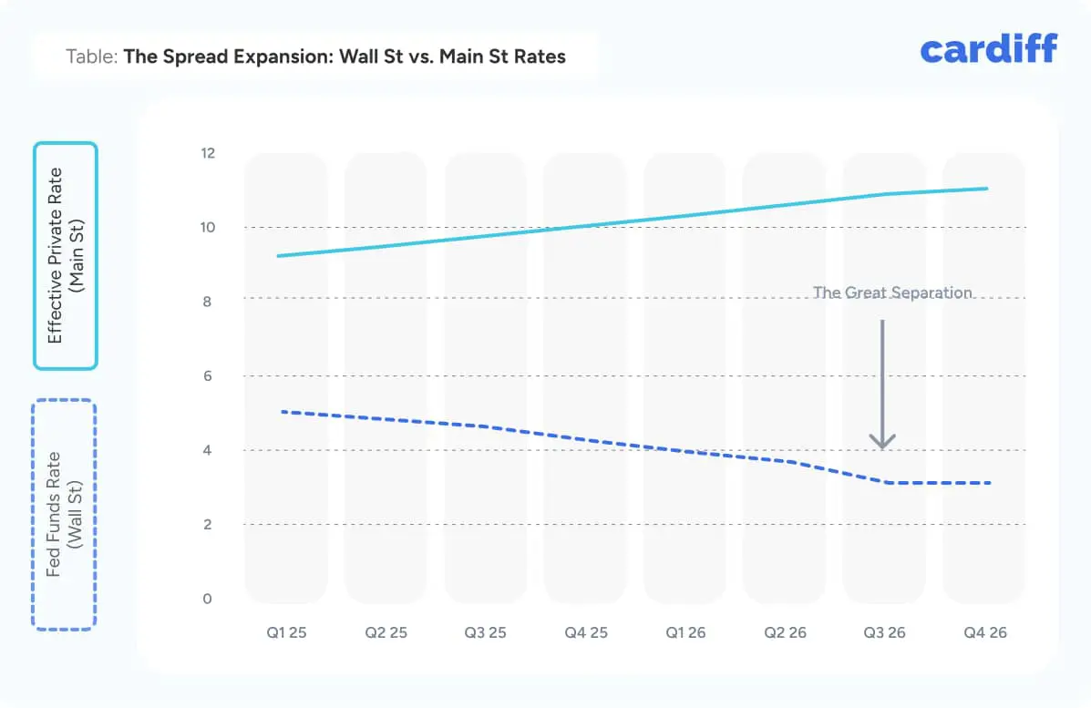 A core focus of the report is the "Prime Trap." For a private business, Cardiff argues the Fed Funds Rate is largely irrelevant. The “Effective Cost of Capital” for SMEs has not dropped; it has risen. While the risk-free rate has compressed, private credit spreads have widened by 150+ basis points for non-investment grade borrowers. The average all-in coupon for a private equipment or working capital loan remains stuck at 9.5%–11.5%. Cardiff advises clients to ignore the “Dot Plot” and model for 9% money in 2026.