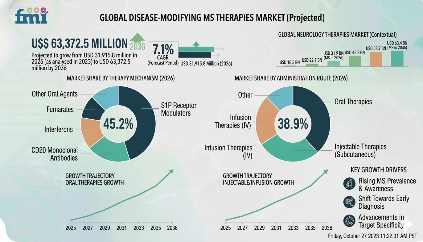 DE, UNITED STATES, March 17, 2026 /EINPresswire.com/ -- The disease-modifying MS therapies market is projected to be valued at USD 31,915.8 million in 2026 and expand to USD 63,372.5 million by 2036, reflecting a steady CAGR of 7.1% over the forecast period. This sustained value growth stems from the structural emphasis on long-term immune modulation in multiple sclerosis (MS) management, with therapies prescribed continuously over decades rather than episodically. Earlier treatment initiation, improved persistence, and prolonged exposure per patient are concentrating spending in chronic care settings, particularly in hospital and specialty neurology environments that support initiation, escalation, and ongoing safety oversight.