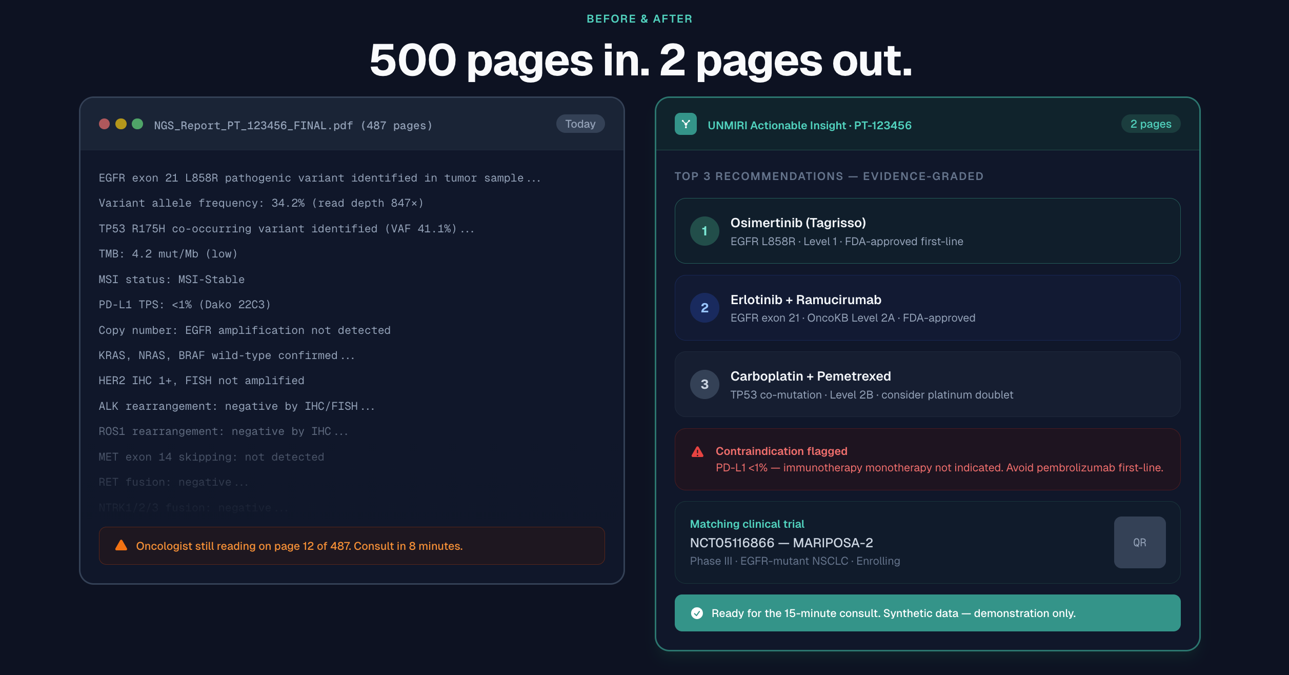 "I was the primary caregiver for my grandmother through most of 2024, taking her to oncology four or five days a week," said Umair Khan, Founder of UNMIRI. "What I saw in those clinics changed how I thought about genomic reporting. Modern oncology has made remarkable advances. The gap between what's in a report and what reaches the consult isn't a limit of the science. It's a limit of how the information is packaged, and UNMIRI was built to close that gap."