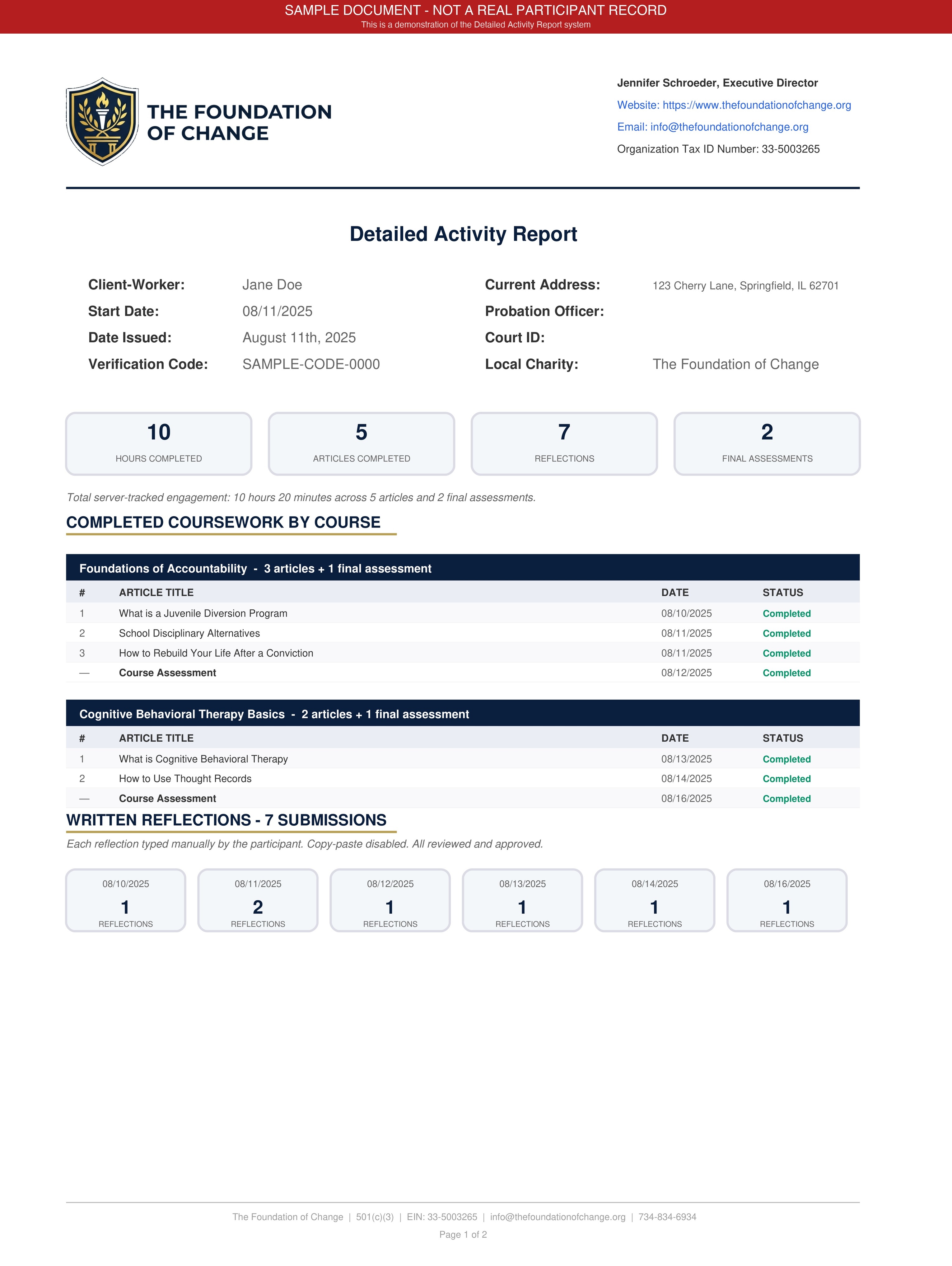 In conjunction with this initiative, the Foundation has deployed its new Detailed Activity Report system. This release provides comprehensive, tamper-proof documentation - including coursework completion, reflection counts, and verified engagement data. The system guarantees 100% data fidelity by ensuring activity records strictly mirror underlying database progress, creating unimpeachable documentation for legal and court-ordered compliance requirements.